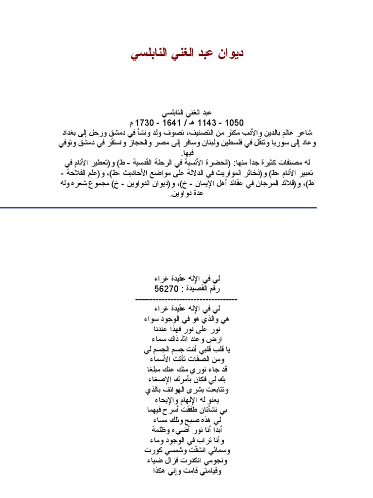 اقرأ وشارك قصيدة صلاة ربي على التهامي للشاعر عبد الغني النابلسي ديوان الشعر قرابة 60 ألف قصيدة فى أكبر مكتبة شعر على الإنترنت. عبد الغني بن إسماعيل بن عبد الغني النابلسي الدمشقي الحنفي 1050 هـ 1143 هـ 1641 1731م شاعر سوري وعالم بالدين والأدب ورحالة مكثر من التصنيف. هنا يمكنك الأستمتاع بقراءه قصائد عبد الغني النابلسي. عبد الغني بن إسماعيل بن عبد الغني النابلسي الدمشقي الحنفي 1050 هـ 1143 هـ 1641 1731م شاعر شامي وعالم بالدين والأدب ورحالة مكثر من التصنيف.